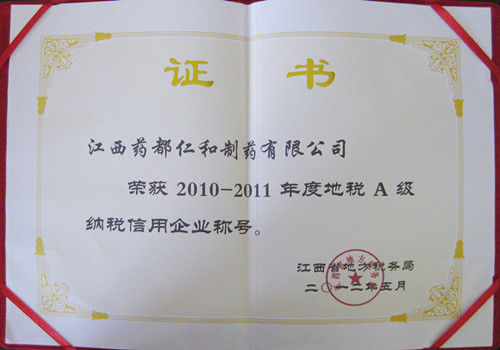 近日,江西省地稅局在井岡山舉辦了首屆A級納稅信用企業評比活動,公司榮獲“A級納稅信用企業”稱號。